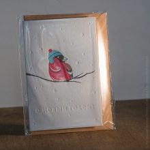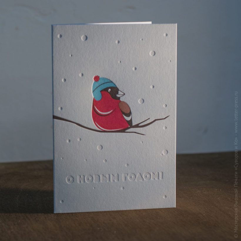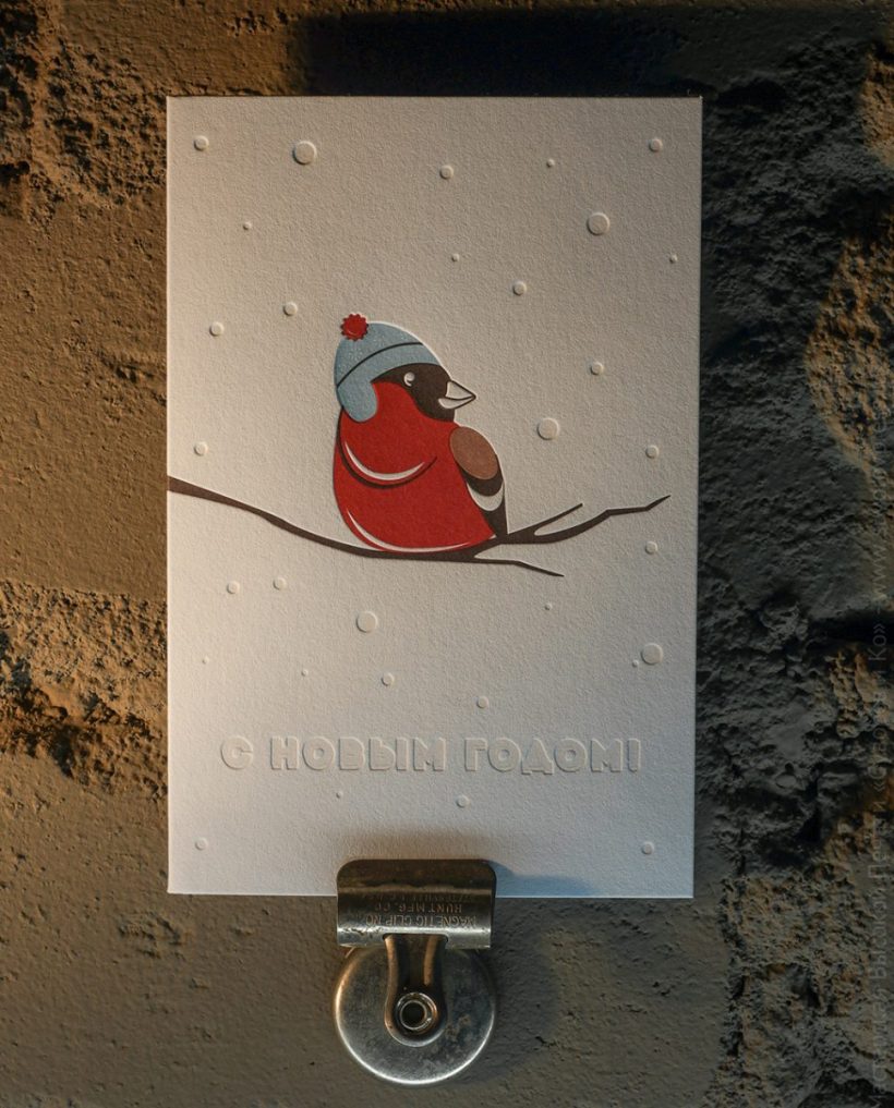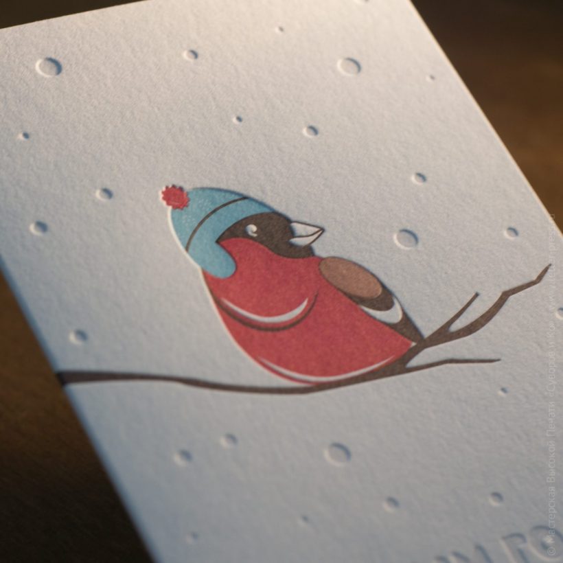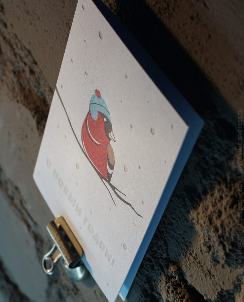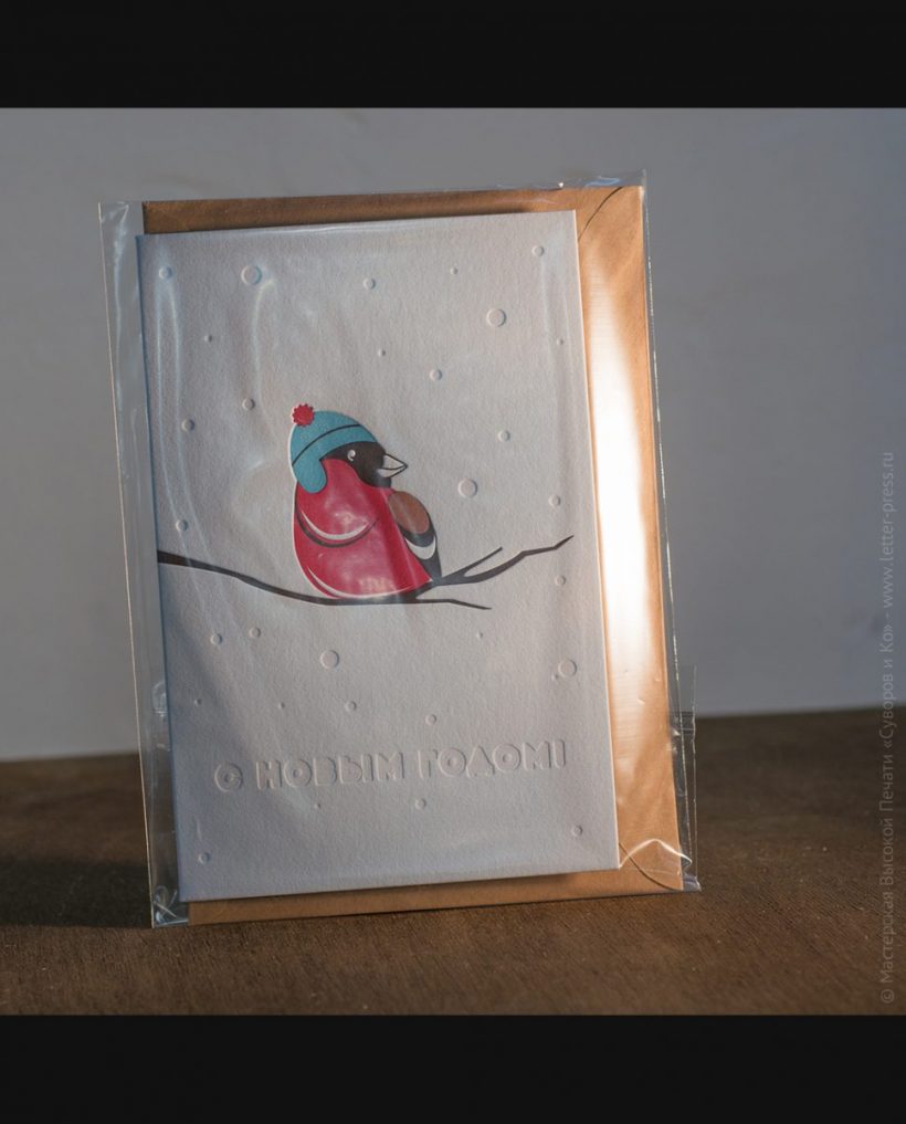 Праздничная, новогодняя открытка на хлопковой бумаге, размер 10х15 см, изготовлена вручную,методом высокой печати, в нашей Мастерской.