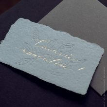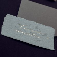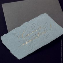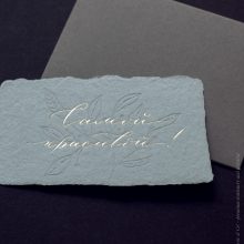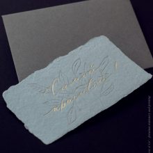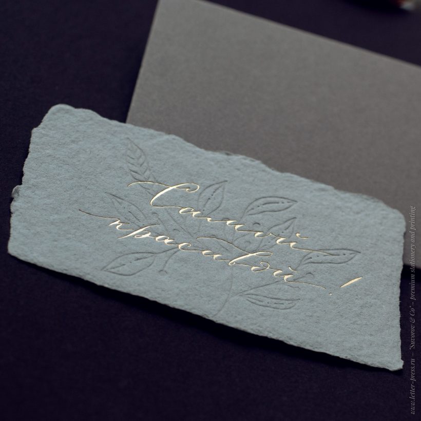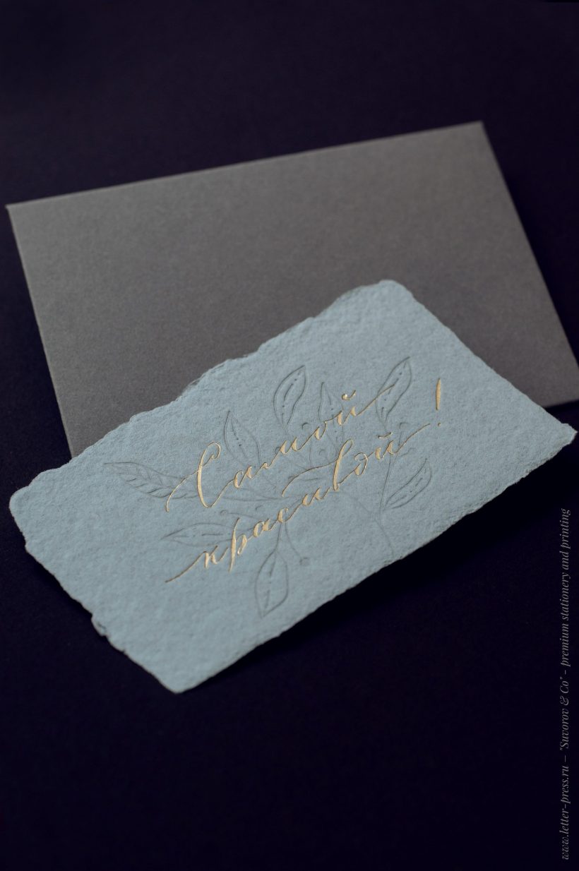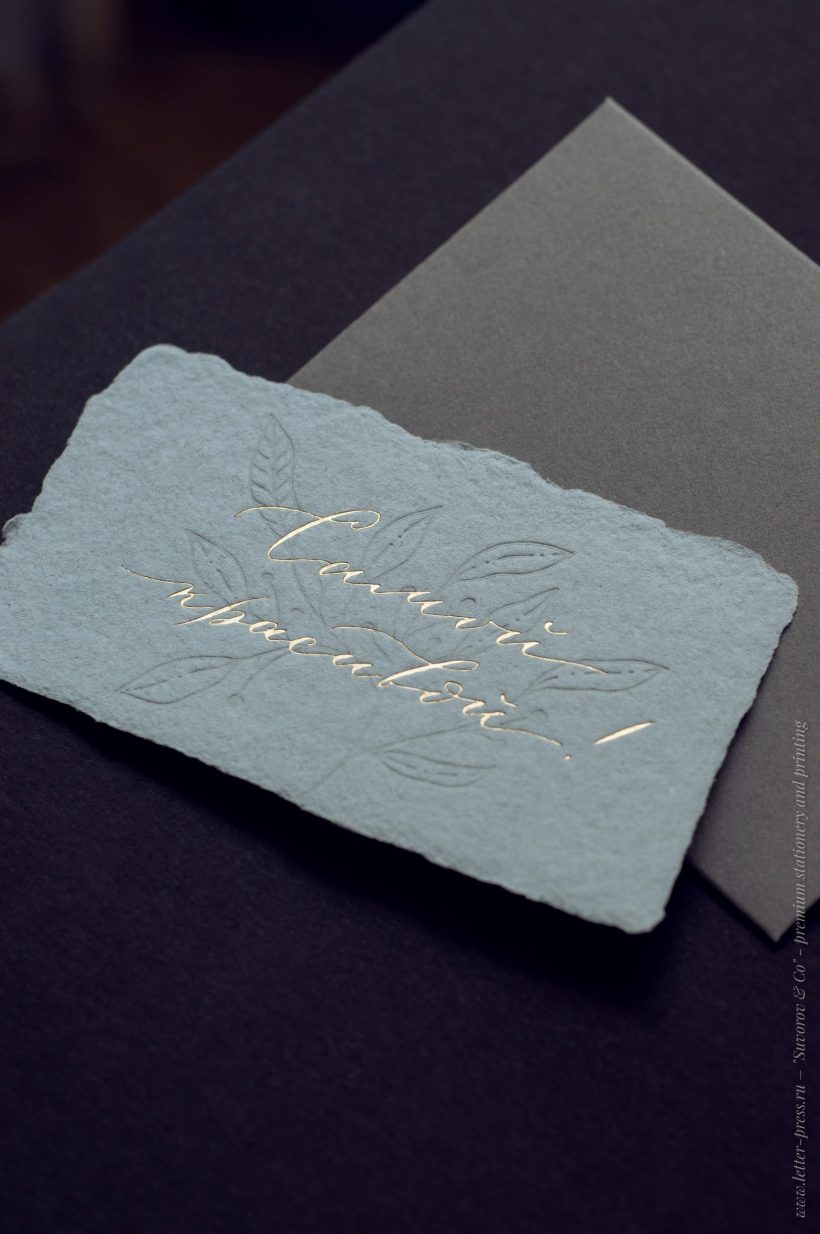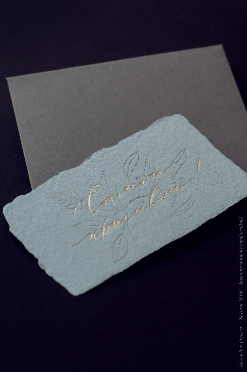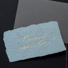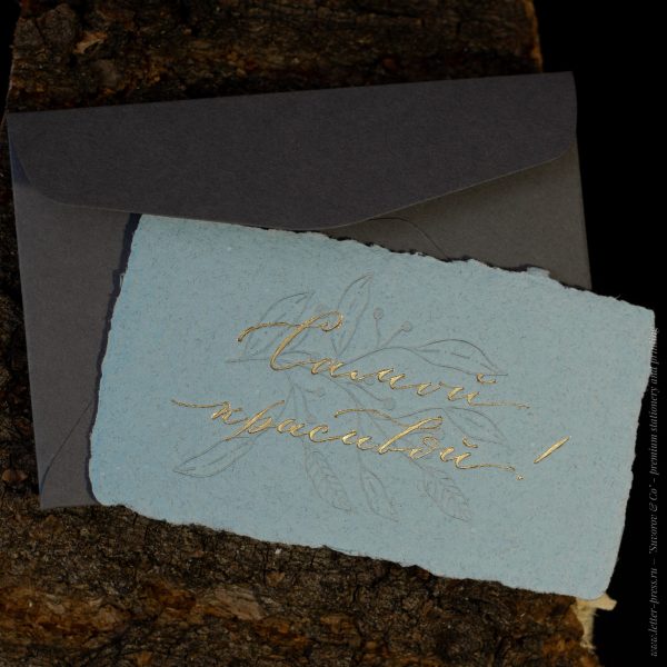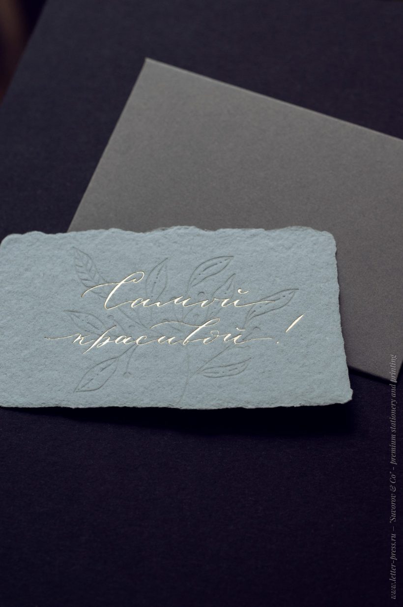 Карточка ручного отлива, серо-голубого цвета, с высокой печатью и тиснением фольгой — пожелание «Самой красивой!»